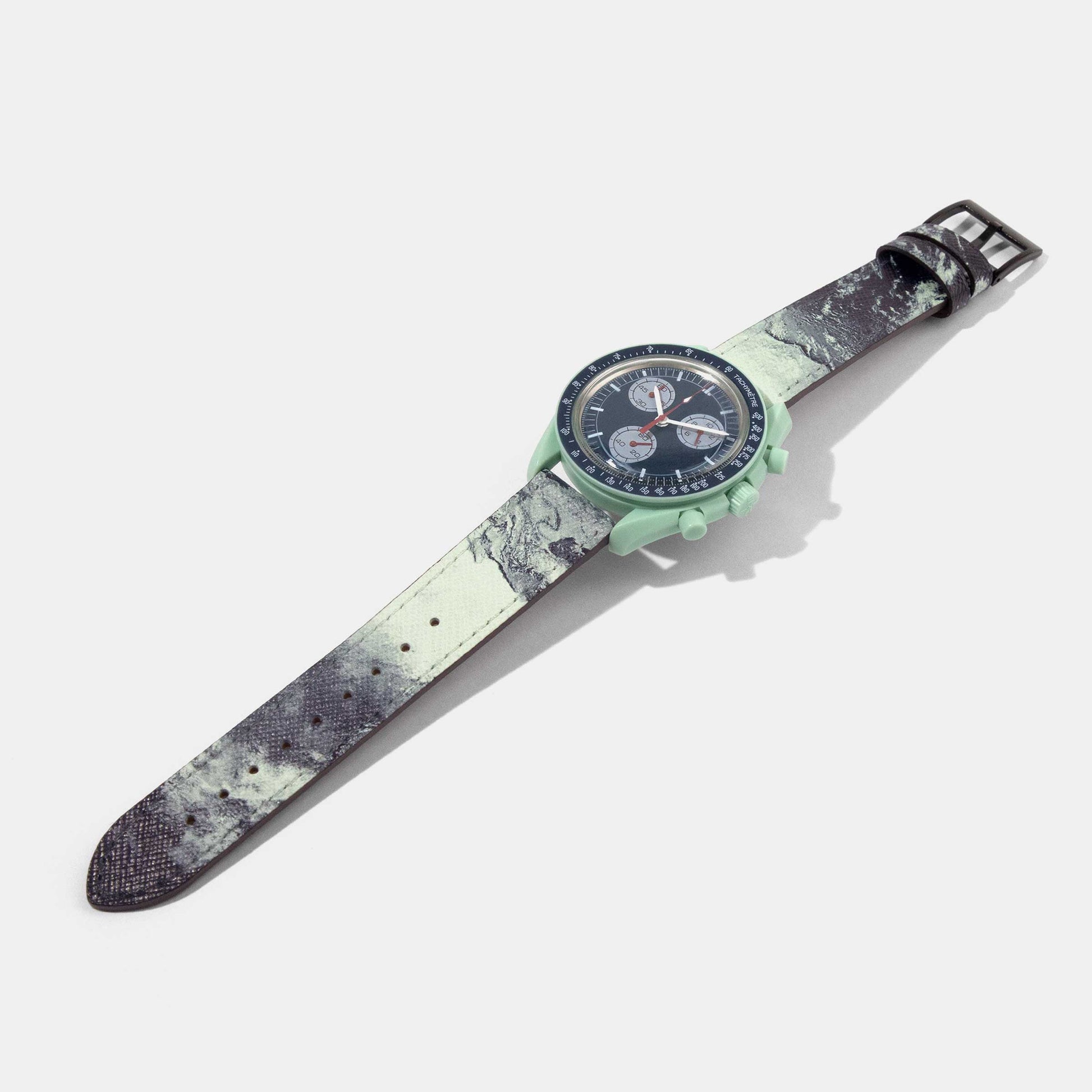 這款 Moonswatch 錶帶採用了綠藍大理石紋理圖案,呈現出我們星球活力四射的生命力與色彩。從茂密的森林到崎嶇的山脈,巧妙地再現了地球上千變萬化的自然景致。 Mission on Earth Moonswatch 錶帶採用優質小牛皮製成,耐用和舒適,在任何場合都能展現您的個人風采,對於那些渴望在腕間佩戴大地豐美的人而言,這無疑是最佳的選擇。